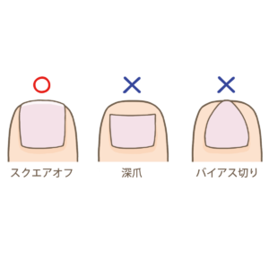 ・爪の先端が四角い形になるように切りましょう。(爪角を短く切り落とさない)
